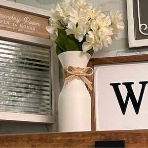 Elegant white ceramic mini vase with a natural raffia bow and flowers Adds a clean, modern touch to any room. Lightweight and versatile for fresh or faux floral arrangements. The white finish complements a variety of decor styles.