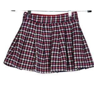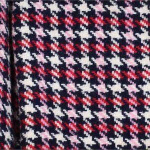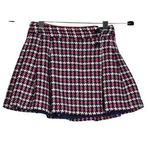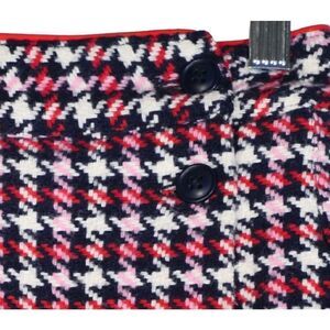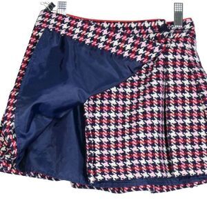 Red blue white and pink houndstooth Wool blend Button side Wrap style with pleats Lined in poly satin