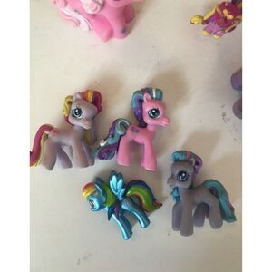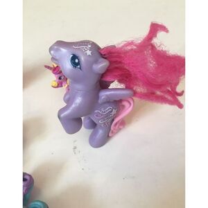 These eight mini ponies are for sale together as a lot. They’re all marked Hasbro except the one shown in the last photo which is a painted unicorn figurine. This is the last figurine appears to be hand-painted and is included just for fun Z‘s. The two ponies with hair have crazy hair - one is so out of control it appears to be naturally formed dreadlocks. Don’t hesitate to ask questions if you have them. They are all (besides the last one) labeled Hasbro.