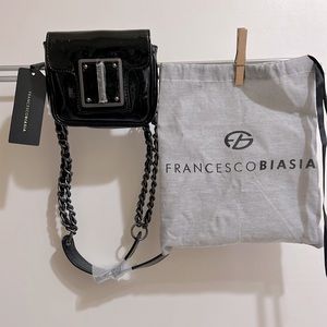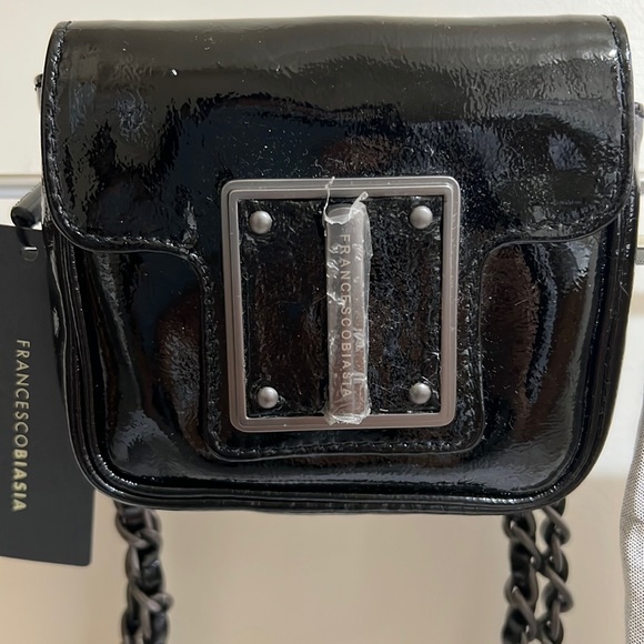 New! Hands-free black patent leather purse. Chain strap can be used over the shoulder or around the waist. Purse measures roughly 5”x5”.