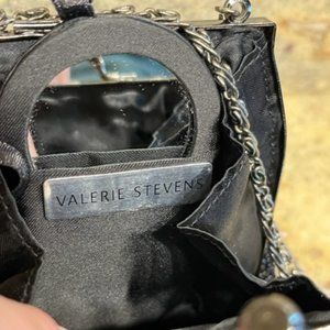 Purse open to 3.5" wide, so there's enough room for driver's license, credit cards, cash, lip gloss, and other evening accoutrements. And the inner pocket holds a circular mirror attached to the purse by a fabric tether. Valerie Stevens logo on outside of inner pocket.