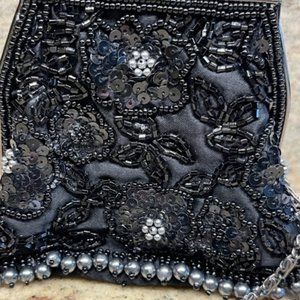 Floral pattern on both sides of this mini-purse made of black sequins and black and silver beads; the silver beads are the center of each black sequinned flower.