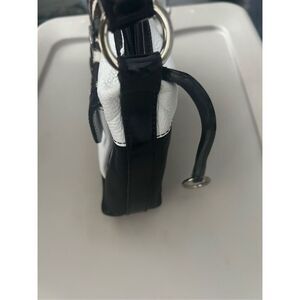 The Mini Sharif Studio Leather & Calf Hair Color Block Shoulder Bag is a stylish and versatile accessory for women. This square-shaped bag features a unique color block design in black and white, accented with fur trim and a silver hardware finish. The mini size makes it perfect for travel, weddings, parties, casual outings, or workwear. The bag includes inner pockets, lined interior, and a packable feature for added convenience. The black and white leather exterior, paired with a black nylon lining, adds a touch of luxury to this vintage-inspired piece by Sharif Studio.