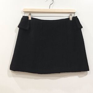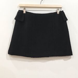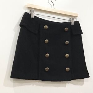 Beautiful, super cute black wool mini skirt with bronze button front and side tabs, size 4. Perfect with your fall boots. One “hook and eye” missing only “eye” (see picture). Approximate measurements: waist 29”, length 14”. Materials: 80% wool, 20% nylon.