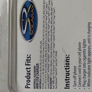 mini USB charger fits phone, blackberry, Motorola and or GPS.