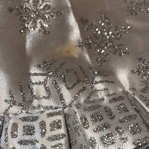 PLEASE NOTE: skirt has a smallish orange circular stain and two small slits/holes. Ornaments, topper and tree are perfect!