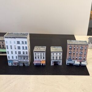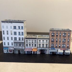 Detailed Z miniature cityscape model with various building designs. Features a mix of colors including white, gray, and brown. these are made by custom Z scale. Made from card stock. and assembled by me.