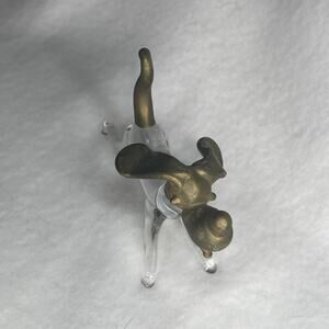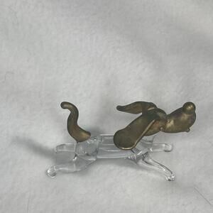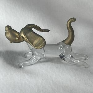 This is a small hand-painted miniature figurine of a dog made of clear glass. The figurine features a gold head and tail, measuring 4 inches in length, 2 inches in height, and 4 inches in width. It belongs to the Animals collection and has a theme of Animals & Dinosaurs. This decorative piece weighs 2 ounces and is suitable for various occasions.