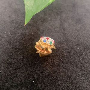 Adorable gold tone miniature turtle pin with sparkling multicolor crystal shell details.