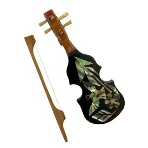 Miniature Handcrafted Wooden Violin Mother of Pearl Inlay Bow Decorative Box
