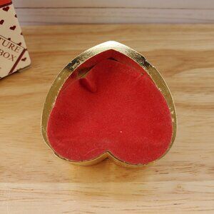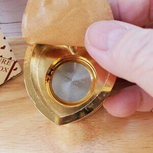 In a quaint corner of your home, this heart-shaped clock box finds its place, whispering tales of love and elegance. With its golden sheen, it captures the essence of timeless romance. Clock pops out of the bottom of the piece. Clock not running.