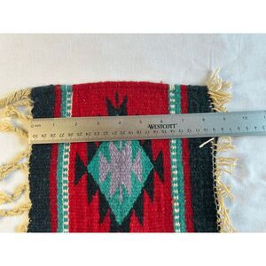 This is a small rug or mat that has a Native American theme to it. It measures about 8x8 inches. It has fringe on the sides of it. It feels like wool to me but I'm not sure about that.