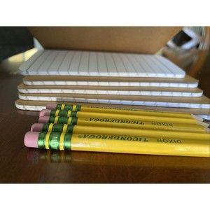 This Miniature Notebook Set comes with a set of 5 Mini Ticonderoga Pencils. The set is perfect for jotting down quick notes or doodling while on the go. The notebook is made of high quality cardboard cover and features lined pages, making it suitable for various purposes.