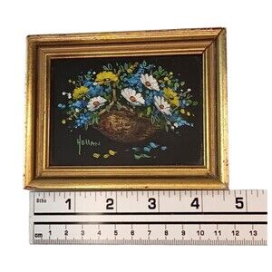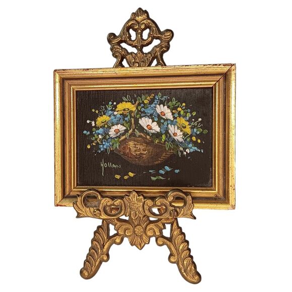 Miniature Oil Painting Daisy Flowers In Wicker Basket Signed Vivian Hollan Swain