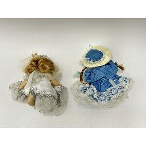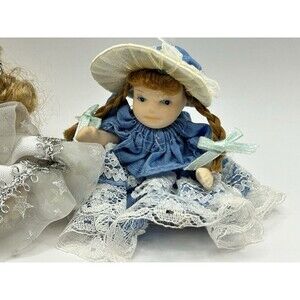 Miniature Porcelain Jointed Dolls w White Silver Star & Blue Dress 2.5" Lot of 2