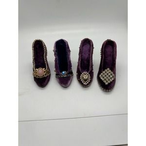 Pre-loved condition of set of 4 miniature high heel shoes decorative pieces. Has jewels and sparkle detail. Some are in better shape than others. Minor discoloration or missing some gems in some areas. Please view photos.