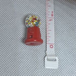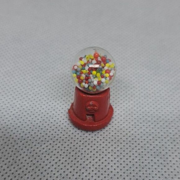 Add a touch of nostalgic charm to your dollhouse or miniature scene with this adorable miniature bubblegum machine! Featuring a bright red base and a clear globe filled with colorful “gum balls,” this tiny accessory brings a playful vintage look to any setting.