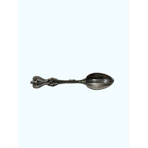 This stunning miniature silver tone brooch, spoon, pin is the perfect addition to any jewelry collection. It features delicate silver tone metal with a beautiful ornate design and a small spoon-shaped pendant. This vintage piece is classic and elegant, perfect for any special occasion.