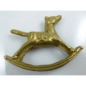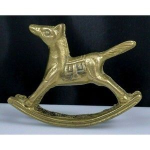This lovely vintage miniature solid brass rocking horse figurine was found at an estate sale. The rocking horse has nice detail with a saddle. It measures approximately 2" high x 2.70" wide x .50" deep. There are no markings to indicate a brand. Please note that there is some vintage wear which includes surface scratches and dark spots (tarnish/patina) and it may need to be polished. I have not cleaned it to preserve its vintage state. It is still in good vintage condition and this nice rocking horse could be displayed on a shelf or used as a paperweight. It could also be used to decorate a baby shower gift.