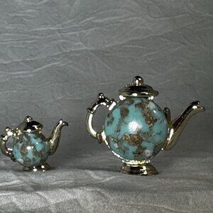 Miniature Turquoise & Gold Teapot Label Brooch Pin Set 2 sizes nice weight