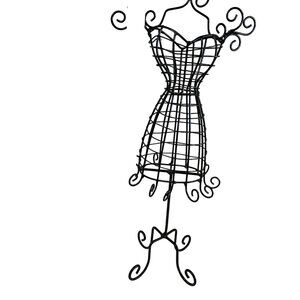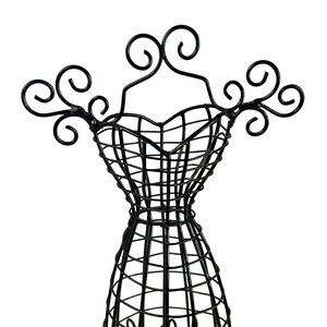 In a quaint corner of your room, where sunlight dances off delicate trinkets, this miniature wire dress form stands. It whispers tales of timeless elegance, each curve and swirl a testament to the art of display. Beyond its beauty, it cradles your cherished jewelry, transforming daily rituals into moments of grace.