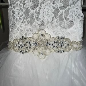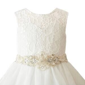 Hidden zipper closure; Fixed beaded belt around the waist; Princess tulle skirt;