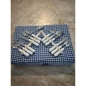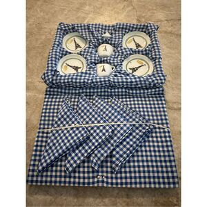 Darling miniature tea set. Includes four gingham, napkins, and cutlery set.