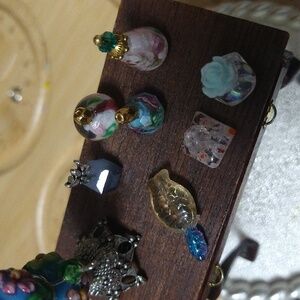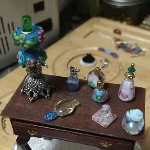 this beautiful lot of miniatures are hand made with love,the small hurricane lamp has beautiful details to it from the tiny flower on the lid to the tiny turn on on the side the top is made with a beautiful green glass tube top, the table is not included , the perfume bottles are made with beautiful beads,my favorite is the fish with the crystal spear,all my sales include extra thank you gifts that I'm sure you will love, especially if you collect miniatures for your doll house, blessings and thank you for stopping by.