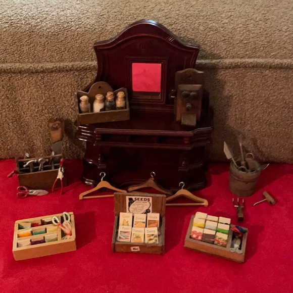 Includes all items pictured! All in great condition and no damage! All tools are metal and wood. Hutch with mirror, filled boxes with seeds, thread, scissors, lace, filled bottles. Furniture, boxes and phone are wood. If you have questions please ask! All very cute and detailed. Would like to sell all together! Smoke free! 😊❤️