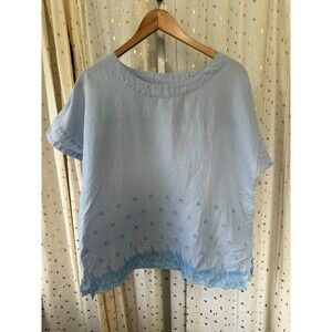 Minibee Blue Summer Linen Tunic Shirt High Low Hem Embroidery Blouse Top L