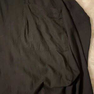 Minibee black midi pocket dress, oversized, baggy, lagenlook with roll tab sleeve. Linen and cotton blend, machine wash, pullover with round neck and buttons. Size L, midi / knee length.