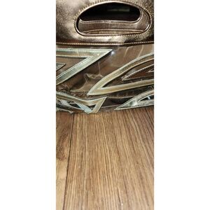 Beautiful bronze/gold/ clear metallic clutch purse has top snap closure Apx 12.5" long 9.5" high 3.5" wide