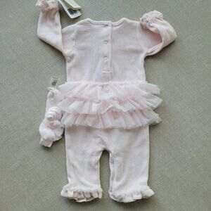 Miniclasix Pink Velour Romper, size 0-3 months. Layers of tulle on front and tulle heart on center. Comes with a matching headband. New with tag.