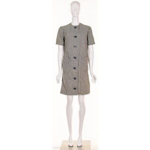 Vintage 60's mod mini dress made from linen in a black and white gingham plaid print. This dress features deep flat front pockets, short sleeves and a button up front.