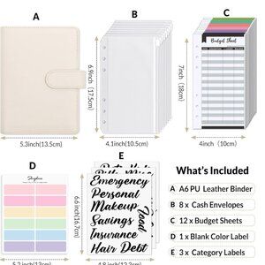 What You Get: A6 PU leather binder cover, 12pcs budget sheets, 8pcs cash envelopes, 3 sheets of category sticker labels, and 12 blank color labels.