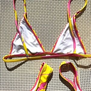 Minimale Animale 3 piece set Tropic Thunder, yellow and pink animal print. All items size small. Lucid top, Wall Street bottom, nolita thong. All my Minimale Animale bikini listings are from my photoshoot/sample/personal collection as the designer of the brand for 10 yrs. If you are do not want a suit unless it has the brand tag please message me direct and I can check your exact item request to let you know, cheers :)