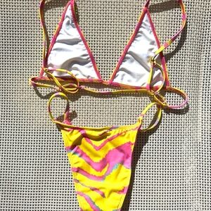 Minimale Animale Bikini Set in Tropic Thunder, Mirage top size small adjustable, on Botton band and back straps. Brief is the Ultra brief, also size small. All my Minimale Animale bikini listings are from my photoshoot/sample/personal collection as the designer of the brand for 10 yrs. If you are do not want a suit unless it has the brand tag please message me direct and I can check your exact item request to let you know, cheers.