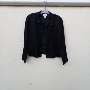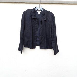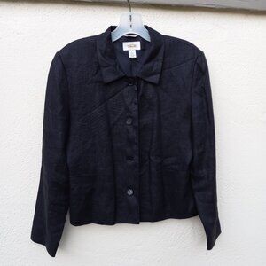 Black button front jacket. Collar. Front pockets. Irish linen. Lined. True black - camera brightening had to be used to better capture some details. Can also be worn unbuttoned as a shacket/cropped shirt over a tank/graphic tee etc. VGUC.