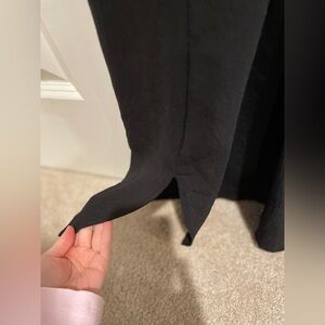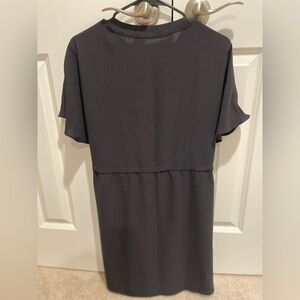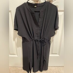This effortlessly chic black shirt dress is the ultimate wardrobe staple. Featuring a sleek, collarless neckline, short sleeves, and a partial button front, it’s designed with comfort and versatility in mind. The adjustable drawstring waist cinches for a flattering fit, while front slits add a touch of movement and ease. Perfect for casual days, workwear, or layering with your favorite accessories. No signs of wear.
