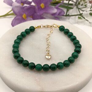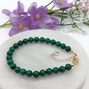 ✨ This striking bracelet is crafted from rare natural malachite beads, each measuring 6 mm in diameter, paired with elegant 18k gold-plated brass fittings.