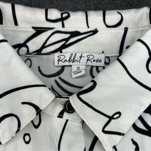 Details: white background. black simplistic faces all over. wrist cuffs unbutton. shiny. silky material! not stretchy.