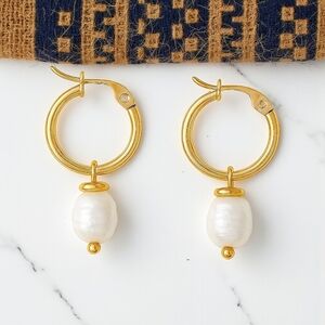 Dainty hoop earrings | Pearl drop hoops | Gold hoops with charm | Minimalist jewelry | Quiet luxury aesthetic | Elegant statement earrings | Trendy gold earrings | Freshwater pearl charm | Versatile 2-in-1 earrings | Everyday hypoallergenic hoops | Modern gold accessories | Poshmark trending earrings | Gold plated