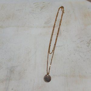 This pretty little necklace has 2 delicate chains, one simple and one with little round accents. There is a cute flat disk pendant at the center of the longest chain with a mirrored finish detail to really catch the light. Lobster claw clasp. Gold toned alloy.