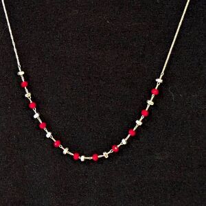 Minimalist beaded silver-tone layered necklace set with red crystals and pendants, each chain adjustable 16–21 inches with a 5-inch extender. This 5-piece set can be worn individually for subtle shine or layered together for a bold statement.