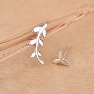 Minimalist Micro Women Silver Leaves Extend an Olive Branch Asymmetry Stud Earrings