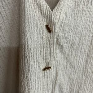 • Design Features: Textured crinkle fabric, short sleeves, gold-tone bar buttons, open collar neckline, relaxed drape