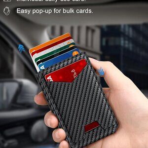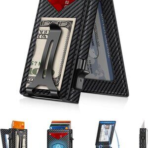 Features: This slim, bi-fold wallet is crafted from durable 6063 space-grade aluminum and genuine leather accents. It offers an ergonomic one-touch pop-up card mechanism, holds 10-12 cards across three pockets, and includes a back money clip that fits 10+ cash. RFID blocking tech keeps your info safe.