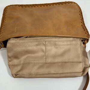 This crossbody bag crafted by The Sak combines functionality with style, featuring a tan leather body and intricate braided trim. Ideal for professional settings, its compact design offers effortless organization and a polished look.