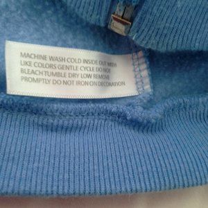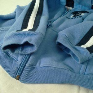 Miniwear boys' knit hoodie jacket. Size 18M. Light blue with dark blue hood lining and black and white stripes down sleeves. Zip front. 2 front hand warmer pockets. Chest 25" (64 cm), back length 11" (28 cm). Cotton and polyester knit. Front zipper. Location 3164-fJ-PEX. Non-smoking cat-friendly home.