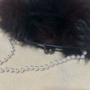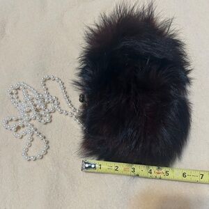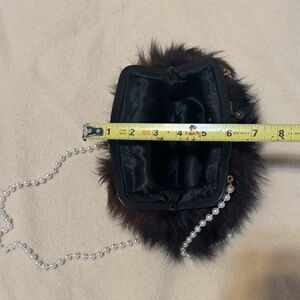 Dark Brown Mink Fur evening Handbag. Pictures of length + width, closure closeup. Faux Pearl long strap. Not Original strap. Silky dark fabric lining. Approx. 10" long, 4" deep, 5" open. Inside linen is slightly discolored in small spots.